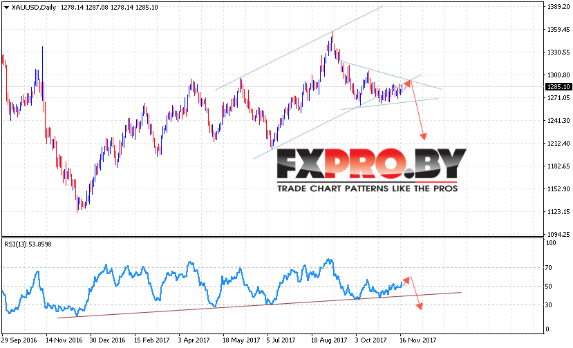 Таким образом, XAU USD прогноз цен Золота на 20 — 24 ноября 2017 предполагает тест пробитой границы канала и продолжения падения цен на Золото с целью ниже уровня 1215, в пользу снижения выступит пробой линии тренда на индикаторе относительной силы, отменой варианта падения станет пробой уровня 1305, что укажет на продолжение роста.