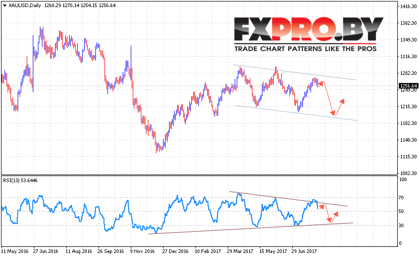 Таким образом, XAU USD прогноз цен Золота на неделю 7 — 11 августа 2017 предполагает попытку снижения котировок в область ниже уровня 1200, дополнительным сигналом выступает тест линии тренда на индикаторе относительной силы, отменой выступит пробой уровня 1295.