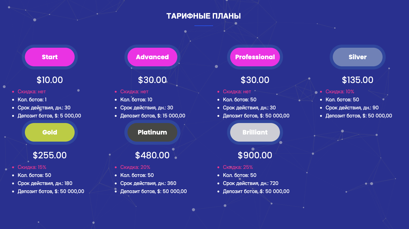На выбор клиентам предлагается 7 тарифных планов. Они отличаются между собой размерами депозитов и количеством запускаемых роботов. Стоимость подписки варьируется от 10 до 900 долларов США в месяц.