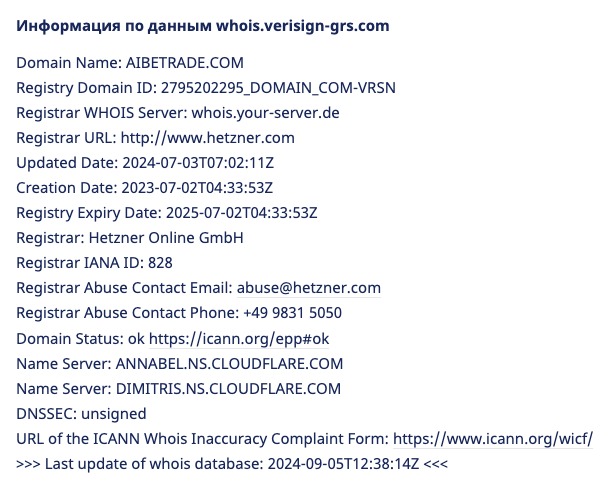 Согласно DNS-записям, доменное имя aibetrade com было выдано регистратором в начале июля 2024-го года. То есть всего около года назад.