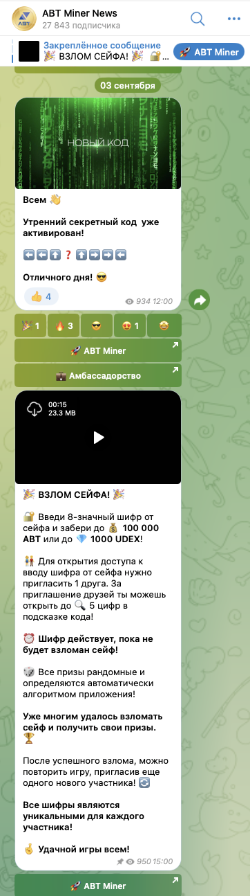 Основной аккаунт проекта Aibetrade в соцсетях – это телеграм-канал ABT Miner News. На него, на 5 сентября 2024-го года, подписано около 28 тысяч пользователей.