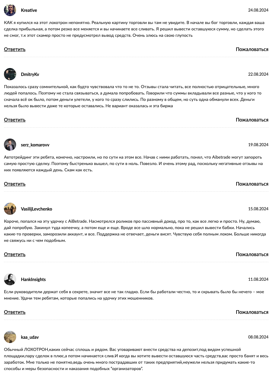 По комментариям на тематических сайтах под обзорами рассматриваемой компании видно, что пользователи скептически настроены в отношении платформы. Люди, в том числе, сообщают, что роботы Aibetrade способны слить даже простую сделку.