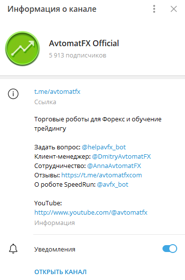 Avtomatfx – это Телеграм-канал, на котором клиентам предлагаются торговые роботы для Форекс и обучение трейдингу. Его модерирует трейдер @DmitryAvtomatFX. О его профессиональном опыте достоверной информации нет. Вопросы сотрудничества обсуждаются с @AnnaAvtomatFX. Помимо Телеграм-канала, автор Avtomat Fx развивает видеоблог в Ютубе. Там 3,3 тысячи подписчиков. Основной контент – реклама торговых роботов.
