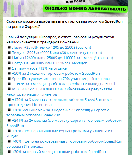 3. Новый продукт – SpeedRun 7.0. Стоимость — $5000. Он якобы может удваивать депозит клиентов в 2 раза за 5 циклов. Минимальный депозит, при котором настройки робота работают максимально эффективно – $1500.