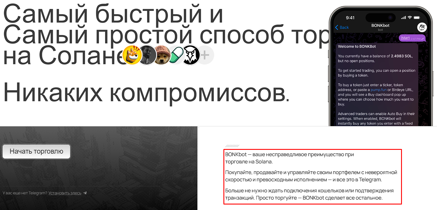 Как мы отмечали ранее, вся торговля в Bonkbot производится через Telegram-бот. Будьте внимательны, в мессенджере создано несколько фейковых ботов со схожим названием, которые могут похитить Ваши средства. Рекомендуем переходить только по ссылке с официального сайта Bonkbot io.