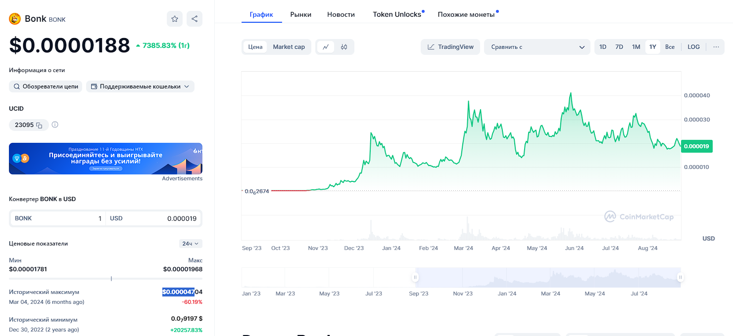 BONK криптовалюта входит в топ-50 рейтинга CoinMarketCap по уровню рыночной капитализации и объему ежедневной торговли. Исторический максимум монета показала в марте 2024 года. Токен торговался по цене 0.000047 USD.