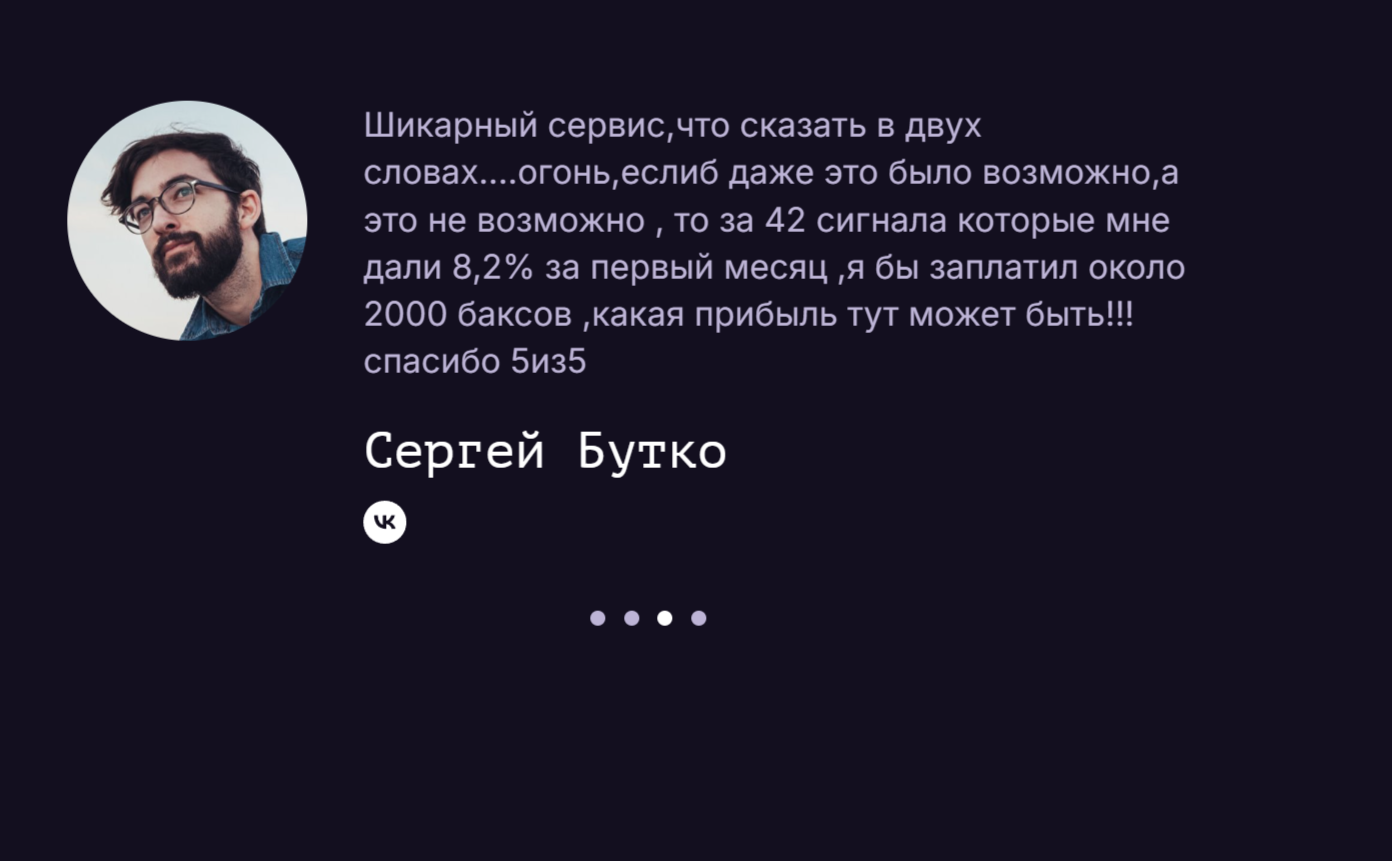 Разработчики Copy Soft обещают, что их клиенты получают доступ к тысячам точных сигналов, которые помогают получать прибыль. При этом можно рассчитывать на большую доходность без рисков просадки и слива депозита.