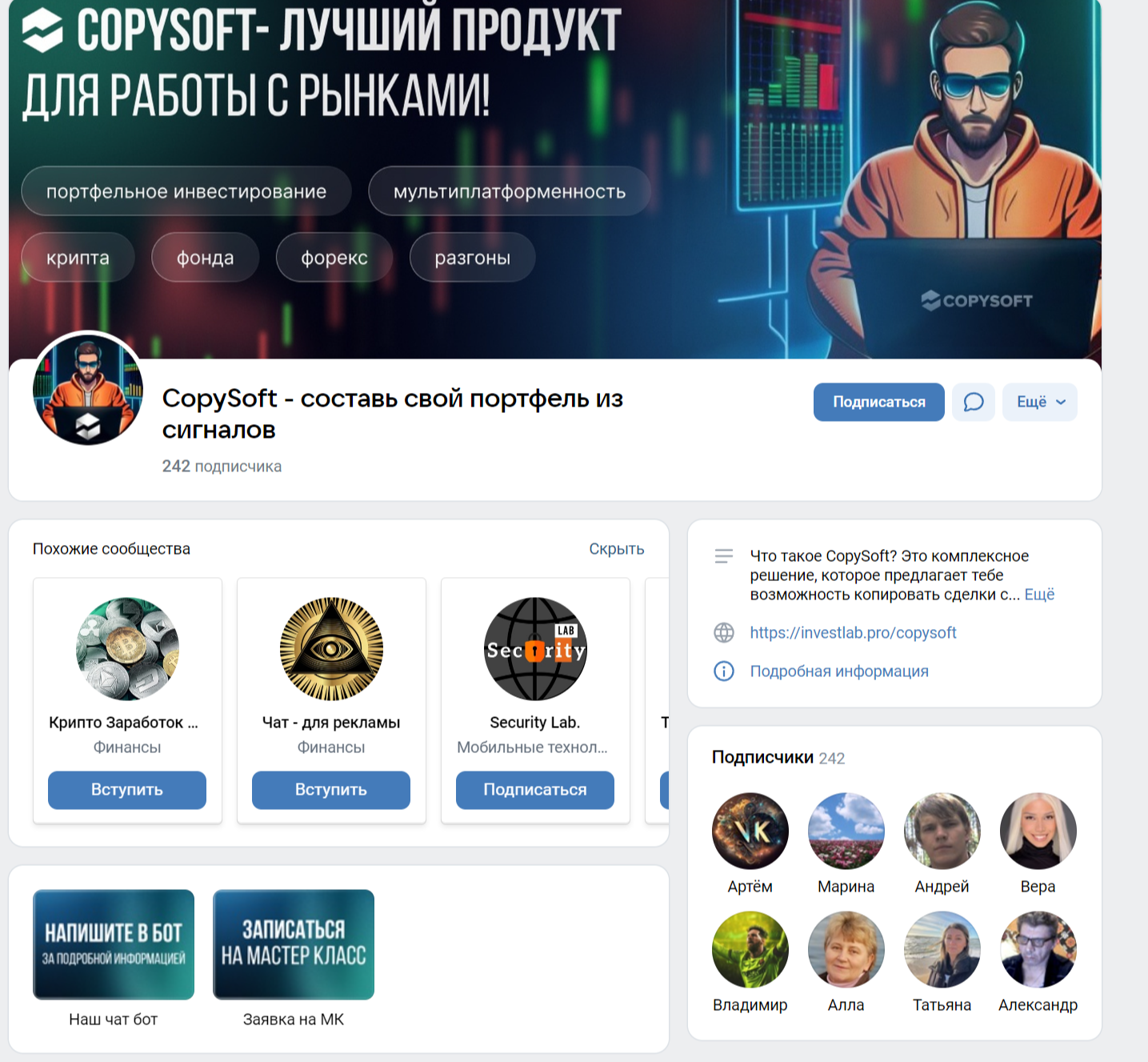 • ВК — CopySoft — составь свой портфель из сигналов. Группа не пользуется большой популярностью, ведь к ней подключено около 240 человек. Новые публикации добавляются редко, а последняя запись была размещена еще в мае 2024-го.