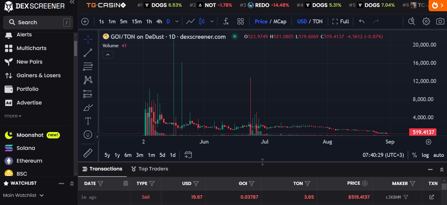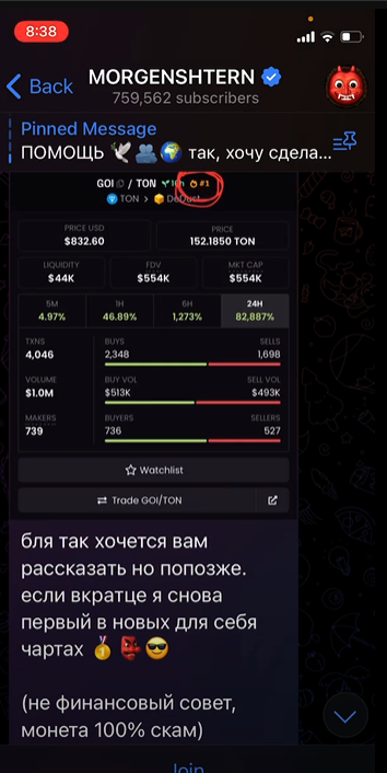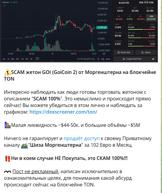 Goicoin — токен, который появился в апреле 2024 года. Его выпустил рэпер Моргенштерн. Он подписал его как 100% скам, но публика решила, что это очередная шутка, поэтому радостно кинулась скупать Goi Coin TON. В начале мая токен стал торговаться на DEX платформах, цена крайне манипулятивна за счет низкой капитализации и скудного объема торгов. Токен достигал отметки 22 953 доллара, сейчас его цена 521 бакс. Ликвидности на 25 тысяч, суточный оборот Goi Coin 2 — 8000 баксов.