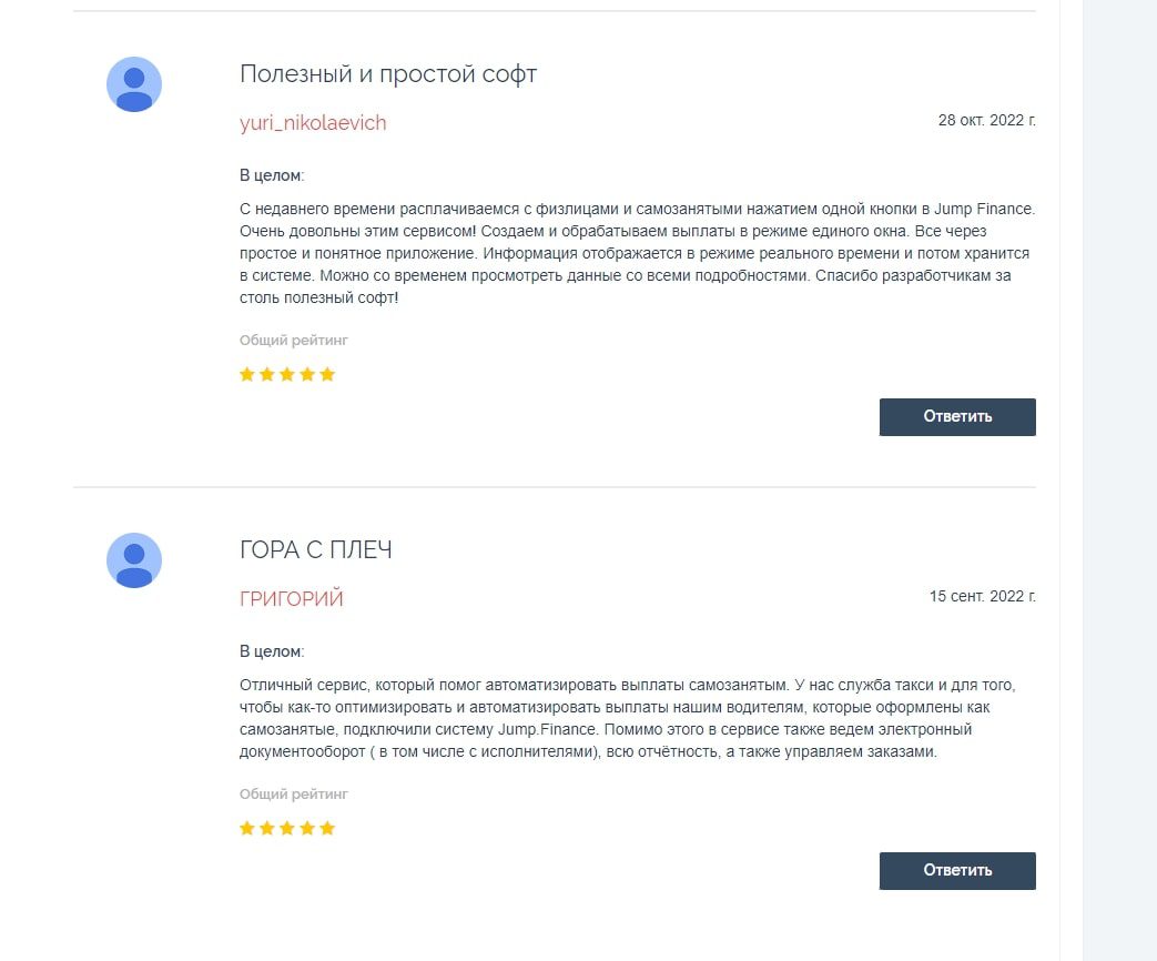 У сервиса противоречивая репутация. Есть как положительные отзывы о Jump.Finance, так и негативные. Пользователи хвалят приложение за удобство и простоту. Утверждают, что сервис облегчил бизнесу взаимодействие с самозанятыми. Однако стиль сообщений вызывает подозрение: все написано рекламным языком, на основании этого мы считаем, что отзывы опубликованы наемными исполнителями.