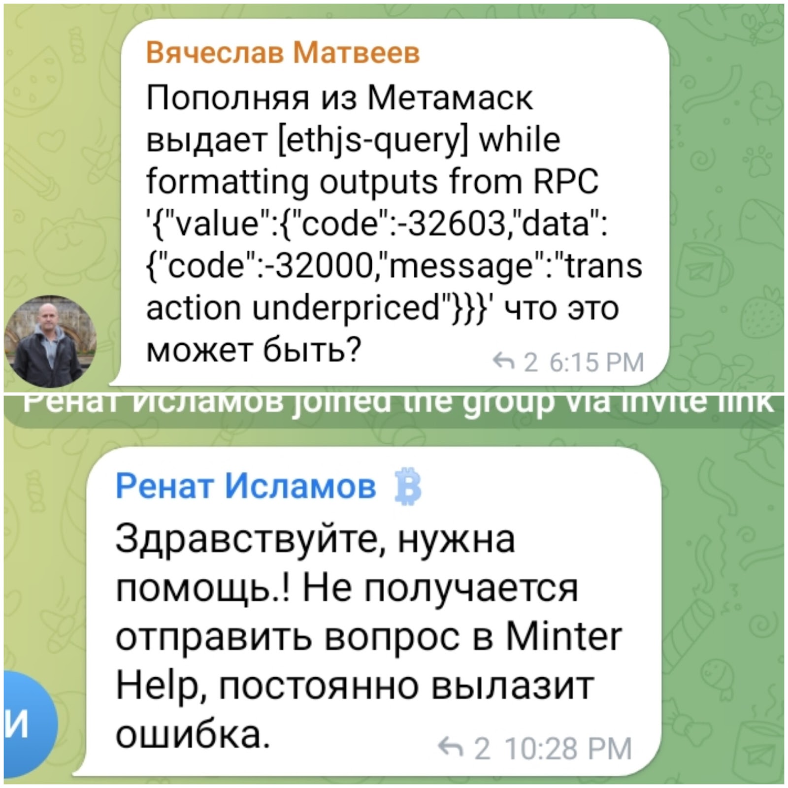Основатели проекта Minter Center предоставляют чат, где пользователи могут делиться высказываниями. Там есть негативные отзывы о проблемах при пополнении счета из Метамаск.