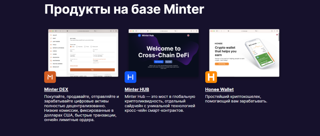 - Minter DEX. Пользователи могут приобретать, продавать, переводить и зарабатывать крипту