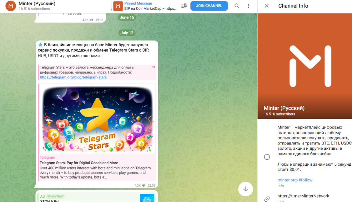 В ленте паблика MinterNetwork можно увидеть особенности проекта. Основатели сообщают о возможностях и изменениях в площадке. Например, 12 июля 2024 года создатели рассказали, что на базе Минтер планируется запуск сервиса по торговли Telegram Stars.