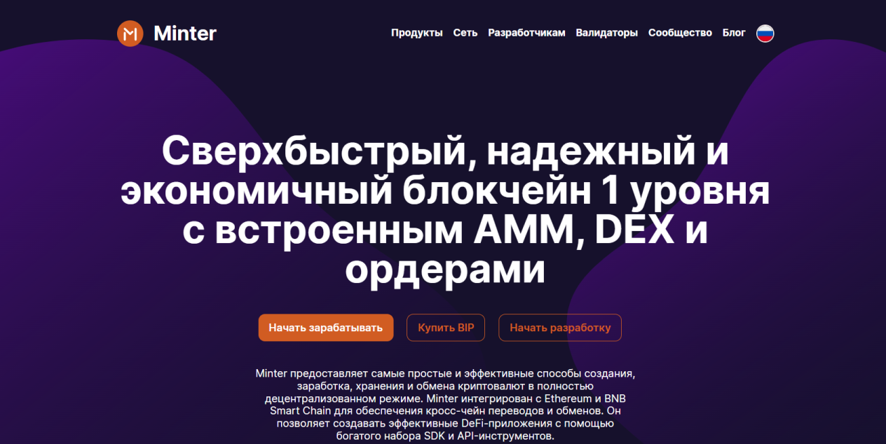 Ознакомиться с возможностями проекта можно с помощью официального ресурса minter network. Платформа настраивается на русский и английский язык. Здесь обозначено, что блокчейн Минтер Нетворк работает с DEX криптовалютами. Еще с цифровыми активами с разными смарт-контрактами и ликвидностью. Целью проекта является облегчить работу пользователям, выпустить собственную валюту и предоставить хорошие возможности для дохода.