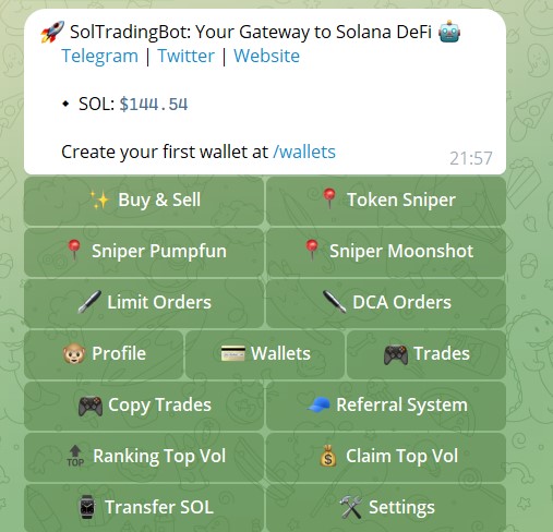 Рассмотрим функции, которые предлагает нам телеграмм-бот solanatradingbot: