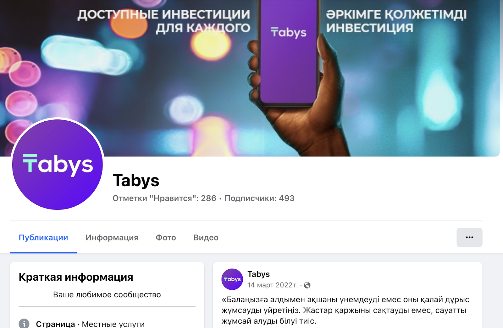 Платформа представлена и на Facebook с ником tabysapp. Здесь у инвестиционной платформы на момент сентября 2024 года всего 493 подписчика.
