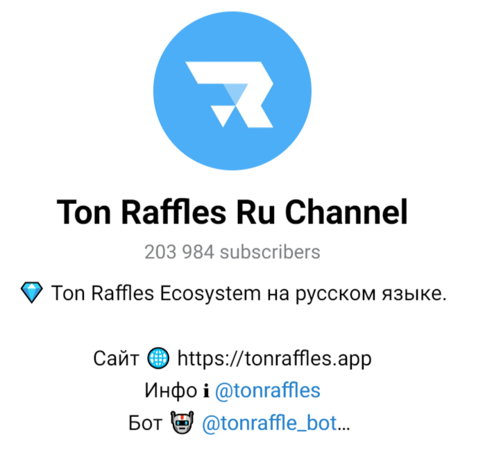 • Канал TonRaffles.Org — Ton Raffles — Телеграм-канал по ссылке tonraffles. Сообщество имеет чисто информативный характер. Здесь можно найти ссылки для покупки NFT и токена, на Телеграмм-бот, а также англоязычное и русскоязычное сообщества.