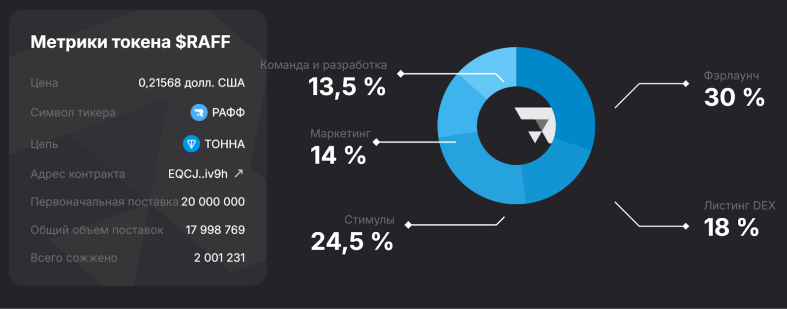 Одна из особенностей проекта ТОН Рафлс — наличие собственного токена под названием RAFF. Разработчики планируют выпуск 100 млн монет. При этом на текущий момент в обороте около 17,99 млн токенов. На текущем этапе сожжено около 2 млн RAFF, а общее количество держателей — 146,5 тыс. человек.