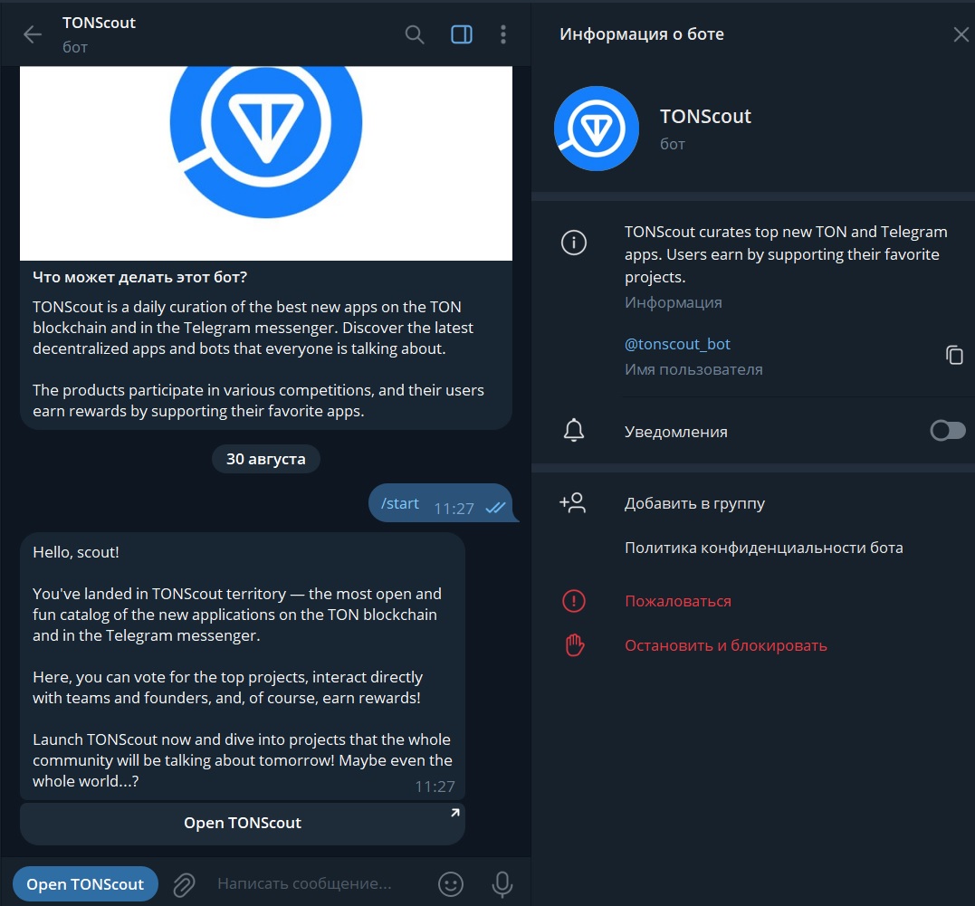 - бот TonScout, запустить который можно с ника tonscout bot.