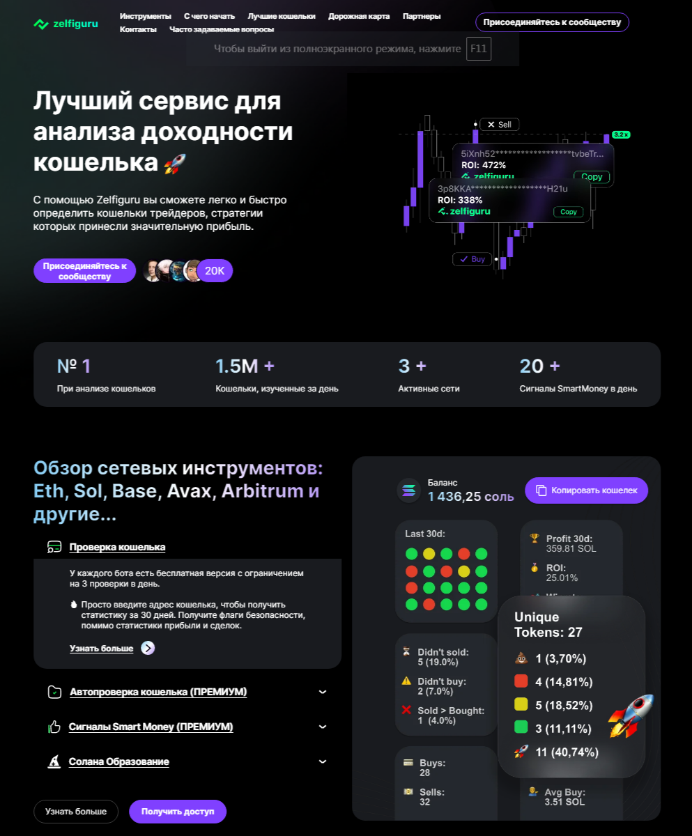 Судя по данным из официального телгерам-канала Zelfiguru On Eth Bot, площадка создана в августе 2023 года. Это подртрвеждаег дата регистрации ютуб-канала и домена Zelfiguru Pro. Но дальше возникают настораживающие моменты. Изначально, видеоблог Зелфигуру велся на русском языке, но потом стал на английском. Сайт на оригинальном языке тоже показывается на английском. При проверке домена страну его регистрации увидеть не удалось, все может быть, что это постарались владельцы и скрыли данную информацию. Но похоже, проект все-таки принадлежит русскоговорящему трейдеру по имени Сергей. В сети оказалось интервью с данной личностью и у комментаторов он вызывает отрицательное впечатление.Вообще, компания Zelfiguru On Base Bot предлагает услуги по проверке кошельков, чтобы выявить доходный и перенять стратегию его владельца. Но также они продают сигналы и проводят Solana образование. Все это происходит в закрытой группе, куда можно попасть приобретя тариф Премиум. На главной странице сайта нам демонстрируют следующие цифры: 1,5 миллиона кошельков изучается в день, 20 сигналов SmartMoney в день и используется 3 активные сети. Но верить этим значениям трудно, так как доказательств они никаких не предоставляют и вся их деятельность не вызывает доверия