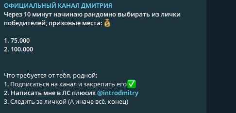 Автор зазывает подписчиков присоединяться к розыгрышам и получать деньги просто так. Обещает раздавать от 75 000 рублей троим победителям. Для участия достаточно только написать ему в личные сообщения, далее из участников он будет выбирать победителей. Для объяснения того, зачем кому-то раздавать деньги незнакомым людям, он публикует скопированный текст, размещавшийся на других каналах с разводом того же жанра. Рассказывает о необходимости раскачивать каналы под перепродажу и желании показать, что деньги бывают легкими. Это полный бред, ничем подобным Дмитрий не занимается.Если принять участие в розыгрыше, со 100% вероятностью придет сообщение о победе. Дмитрий предложит забрать приз, но для этого сначала придется отправить деньги ему. Это якобы нужно для повышения доверия в глазах банка, который иначе не позволит сделать перевод. Далее попросит 13% от выигрыша для оплаты налогов. Если заплатить и их, то будет вытягивать новые суммы до бесконечности под все новыми поводами. Ради этого развода и создавался канал.