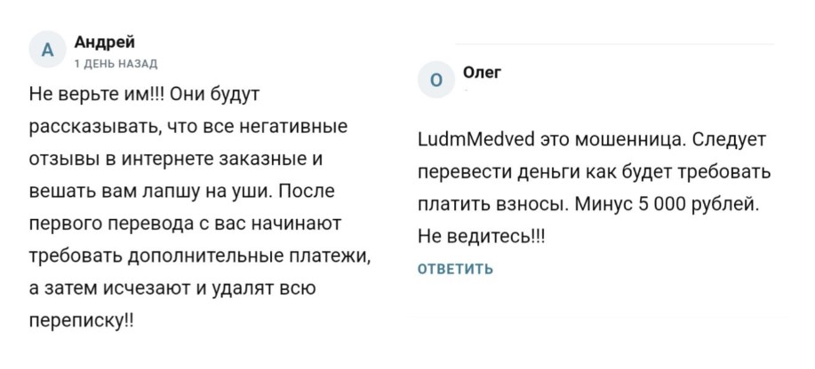 Начинающие трейдера также сомневаются в честности проекта. В своих отзывах о LudmMedved они рассказывают о том, как устроена мошенническая схема. Сначала клиенту активно вешают лапшу на уши, рассказывая о прибыльности проекта и отсутствии рисков. После внесения депозита и проведения торговой сессии с пользователя начинают требовать некую комиссию, которая случайным образом возникла при выводе средств. После ее оплаты аккаунт клиента отправлялся в блокировку.