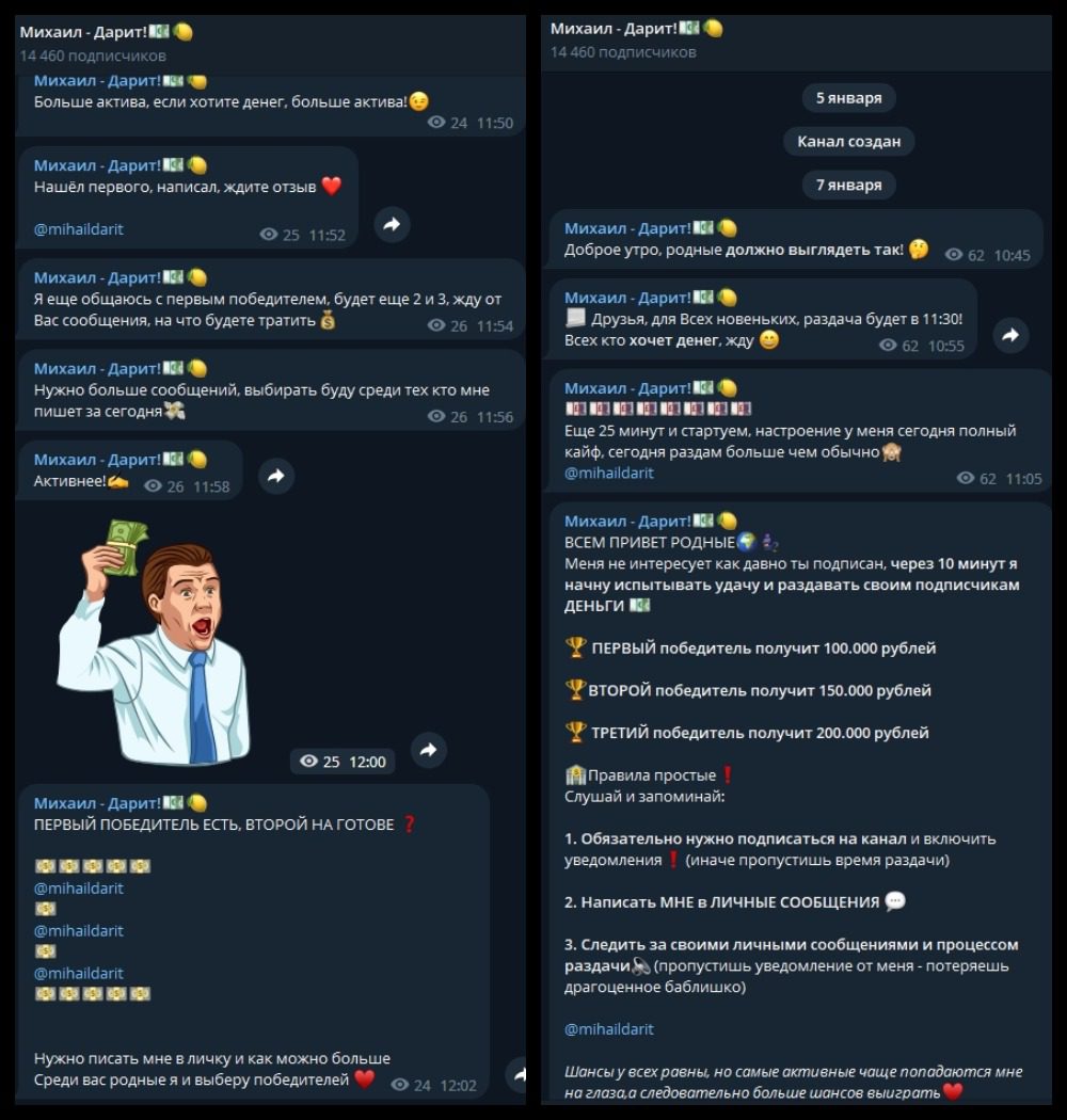 Его наполнение предназначено лишь для воздействия на сознание клиентов и реализации развода Михаила Василянского, базирующегося на проведении конкурсов по раздаче денег. Филантроп обещает от 100 до 200 тысяч рублей за подписку на ресурс, а победители выбираются рандомно по уникальным ID пользователей в мессенджере.