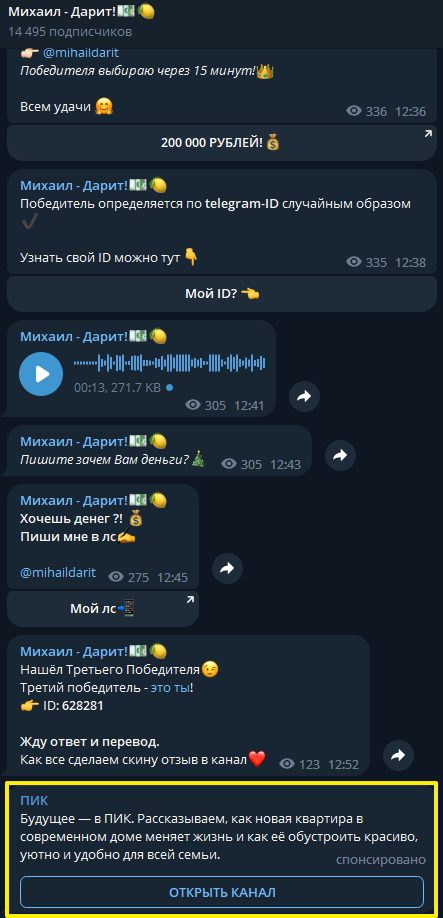 Отказ в отправке денег приводит к блокировке клиента, что является классическим методом мошенников в Телеграмм. Руководитель проекта зарабатывает и на рекламе сторонних ресурсов — одним из них является блог застройщика ПИК, что выглядит странно для топовой градостроительной компании.
