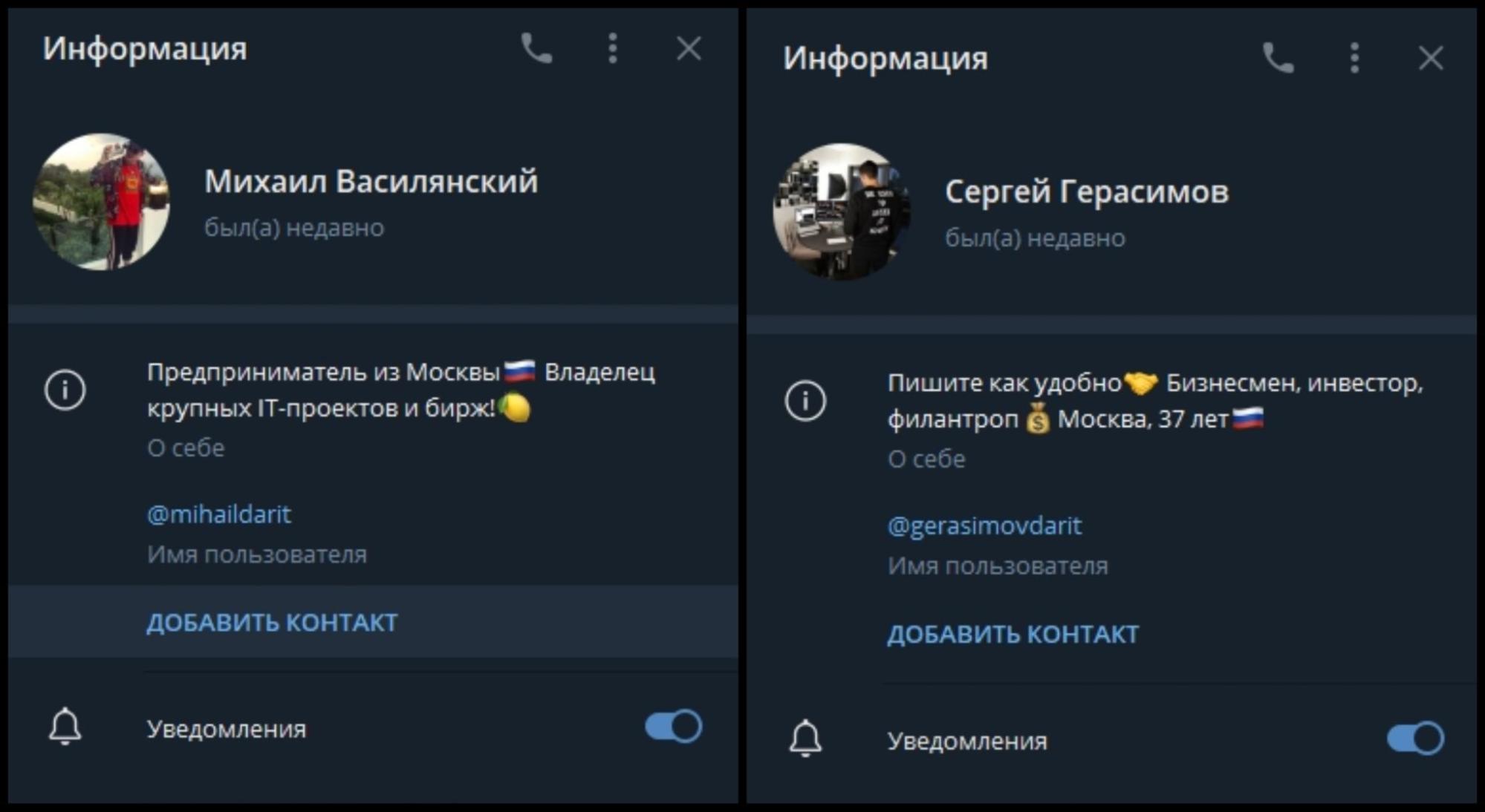 Аналогичный расклад наблюдается и при установлении сходства молодых людей — Сергей Герасимов может являться как псевдонимом админа, так и подельником для развода клиентов. На фото профилей предприниматели предстают перед читателями в образе «золотой молодежи», демонстрируя атрибуты красивой жизни и среди контента мошеннического канала.