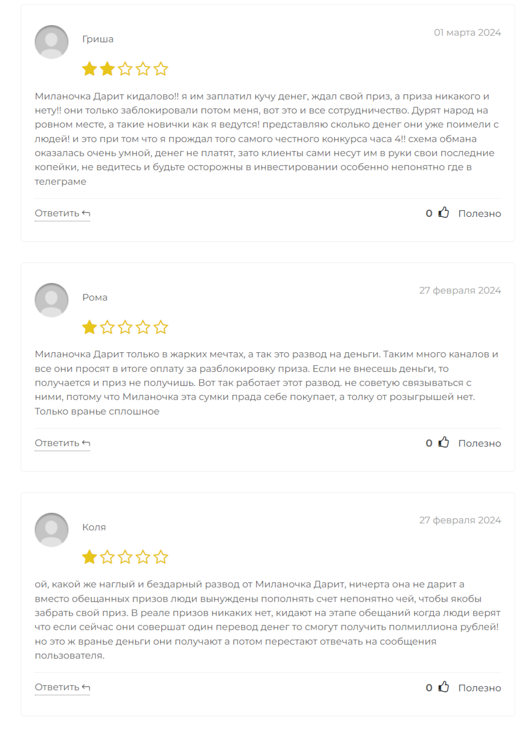 Что касается положительных отзывов о мошеннице Миланочка Дарит на самом канале, они куплены и имеют рекламный характер. Дополнительным подтверждением обмана стал тот факт, что проект и вовсе был удален.