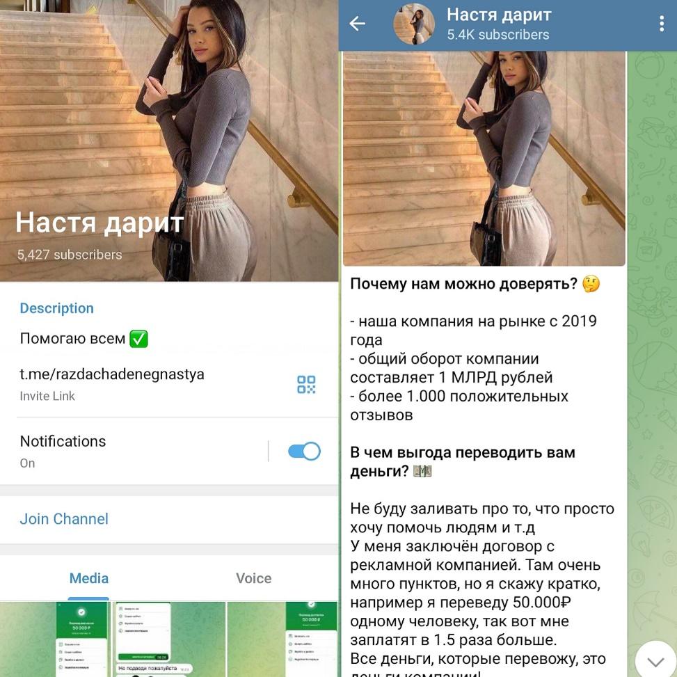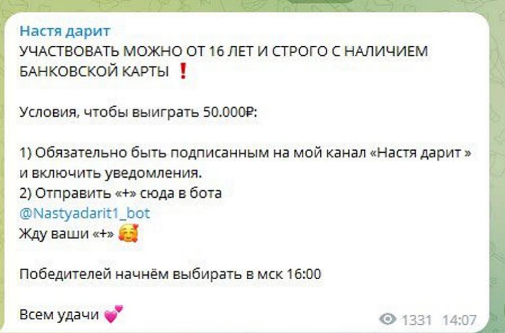 Настя Дарит — мошеннический Telegram канал, где якобы просто так проводят розыгрыши с возможностью получить большие деньги. Создатели уверяют, что делают это с чистыми помыслами. Все это сплошной обман, и никто здесь ничего не выплачивает. По какой схеме работают аферисты, узнаем в обзоре.