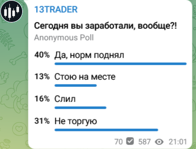 Иногда выходят опросы, в которых трейдер спрашивает сколько заработали подписчики по его сигналам. Насколько честно люди отвечают, ясности нет.