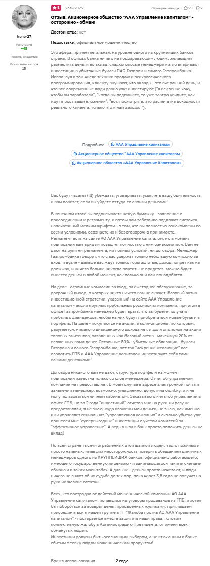 Имеются негативные отзывы о проекте Акционерное общество «ААА Управление Капиталом». Клиенты описывают случаи, когда люди приходили в отделения Газпромбанка с намерением продлить или открыть обычный вклад, но под влиянием менеджеров подписывали договоры на доверительное управление или покупку паев фондов под управлением АО «ААА Управление Капиталом».