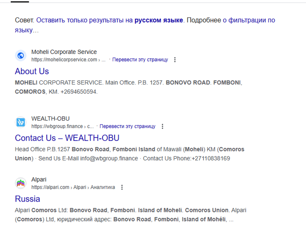В качестве основного адреса заявлен Bonovo Road, Fomboni Island of Moheli Comoros Union. По этим координатам располагается сразу несколько брокерских компаний и бирж – все они созданы по единому принципу и шаблону, уже не раз были замечены в скаме.