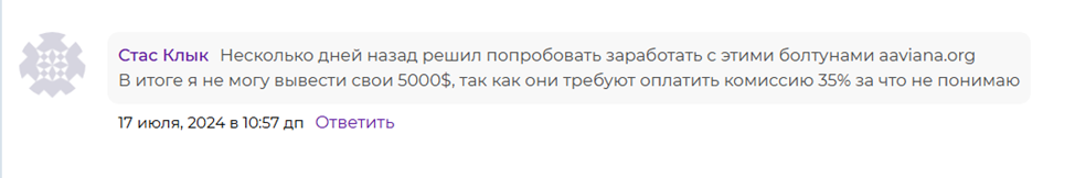 Отзывы едины во мнении – клиенты не могут вывести деньги с биржи Aaviana. Каждый инвестор сталкивается с непреодолимым бюрократическим барьером: от многомесячного прохождения верификации до фейковых требований оплатить налоги и комиссионные сборы.