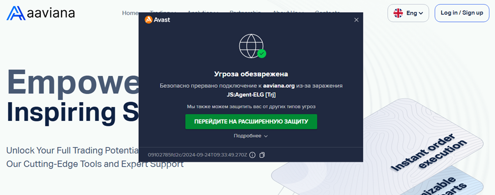 Если верить антивирусу, портал биржи Aaviana Org заражен троянским вирусом. Таким образом, мошенники крадут не только депозит, но и персональные данные клиентов, что в дальнейшем может привести к еще большим финансовым потерям.