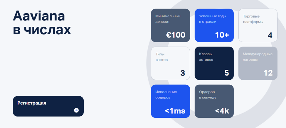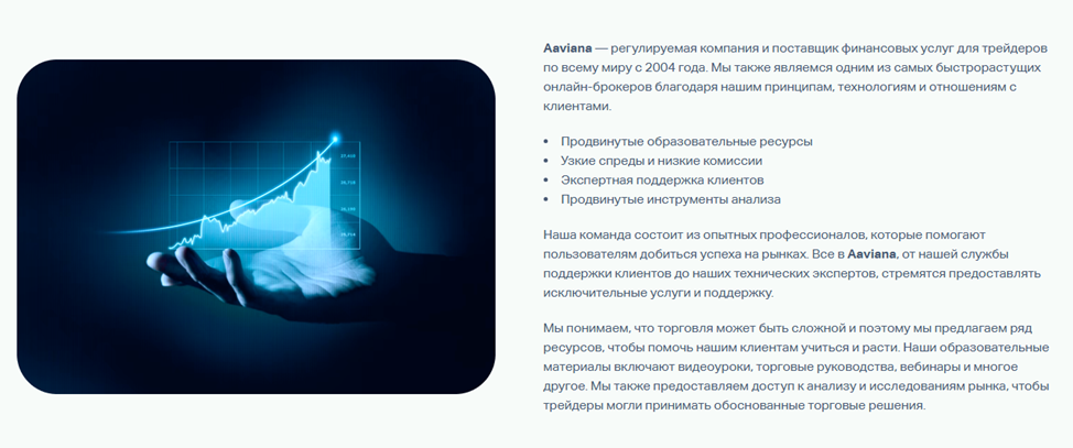 Презентационные материалы на официальном сайте представляют Aaviana Company, как крупный и надежный бизнес 20-ти летней историей успешной работы. В качестве основной миссии быстрорастущим брокером заявлено создание возможности для каждого человека инвестировать и торговать на финансовых рынках, независимо от гражданства и текущего местоположения.