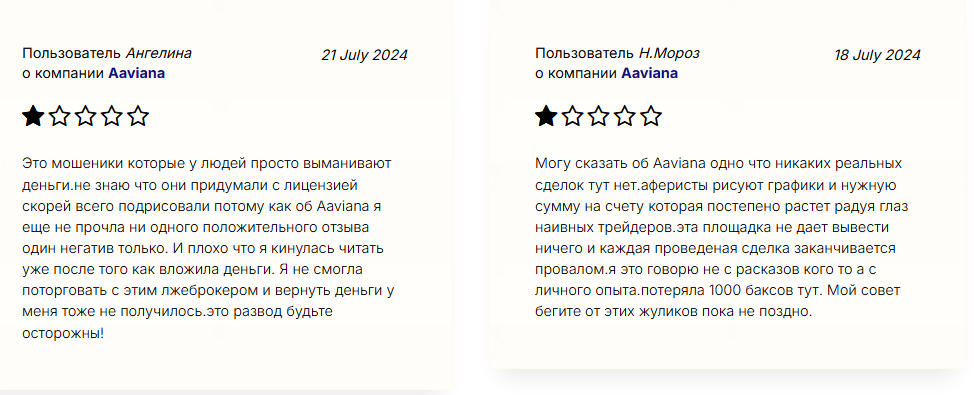 Если бы перед отправкой депозита люди читали отзывы о сервисах “Аавиана”, они бы точно отказались от этой бесперспективной затеи. Жертвы жалуются на невозможность связаться с представителями конторы, необоснованные требования заблаговременно оплатить комиссии, страховки и сборы, беспричинную блокировку аккаунта без возможности вывода денег. Бывшие пользователи однозначно сходятся во мнении, что под брокерским терминалом скрывается лохотрон, который нужно побыстрее прикрыть.