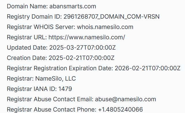 Сайт abansmarts com был зарегистрирован недавно, 21 февраля 2025 года. Срок действия регистрации домена истекает 21 февраля 2026 года. Это указывает на всего лишь годичную валидность. Недавняя регистрация и короткий срок действия домена вызывают вопросы о долговечности и стабильности компании.
