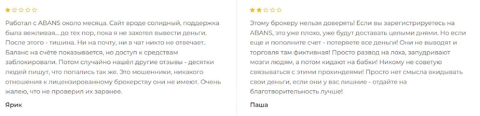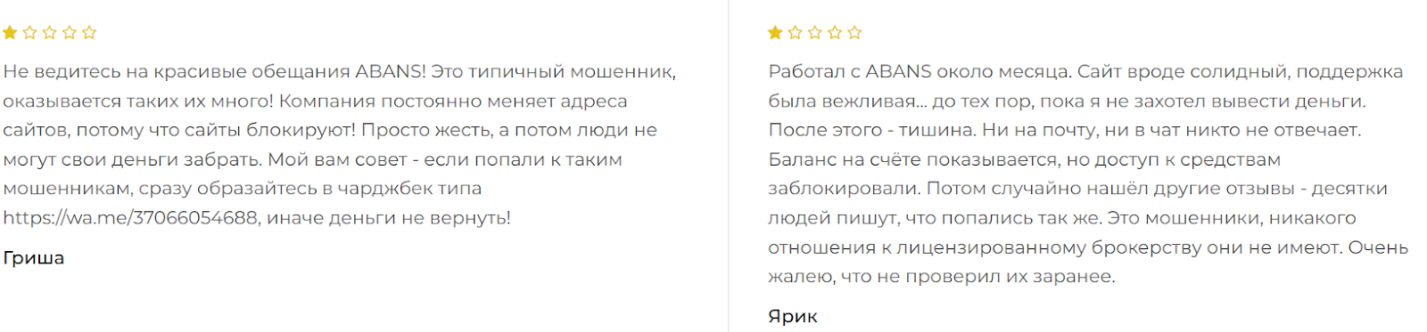 Другой клиент поделился личным опытом работы с ABANS около месяца. По его словам, на первый взгляд сайт выглядит солидно. Поддержка была вежливой до момента запроса на вывод денег. После данного обращения общение прекратилось. Ни на почту, ни в чат ответов не последовало, а доступ к балансу оказался заблокированным. Этот же трейдер наткнулся на множество аналогичных отзывов, где десятки людей рассказывают о похожей ситуации.