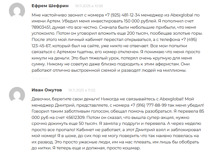 На независимых площадках только негативные отзывы об abexglobal com. Люди описывают одинаковую схему развода. Менеджеры активно звонят с российских номеров и убеждают внести деньги.