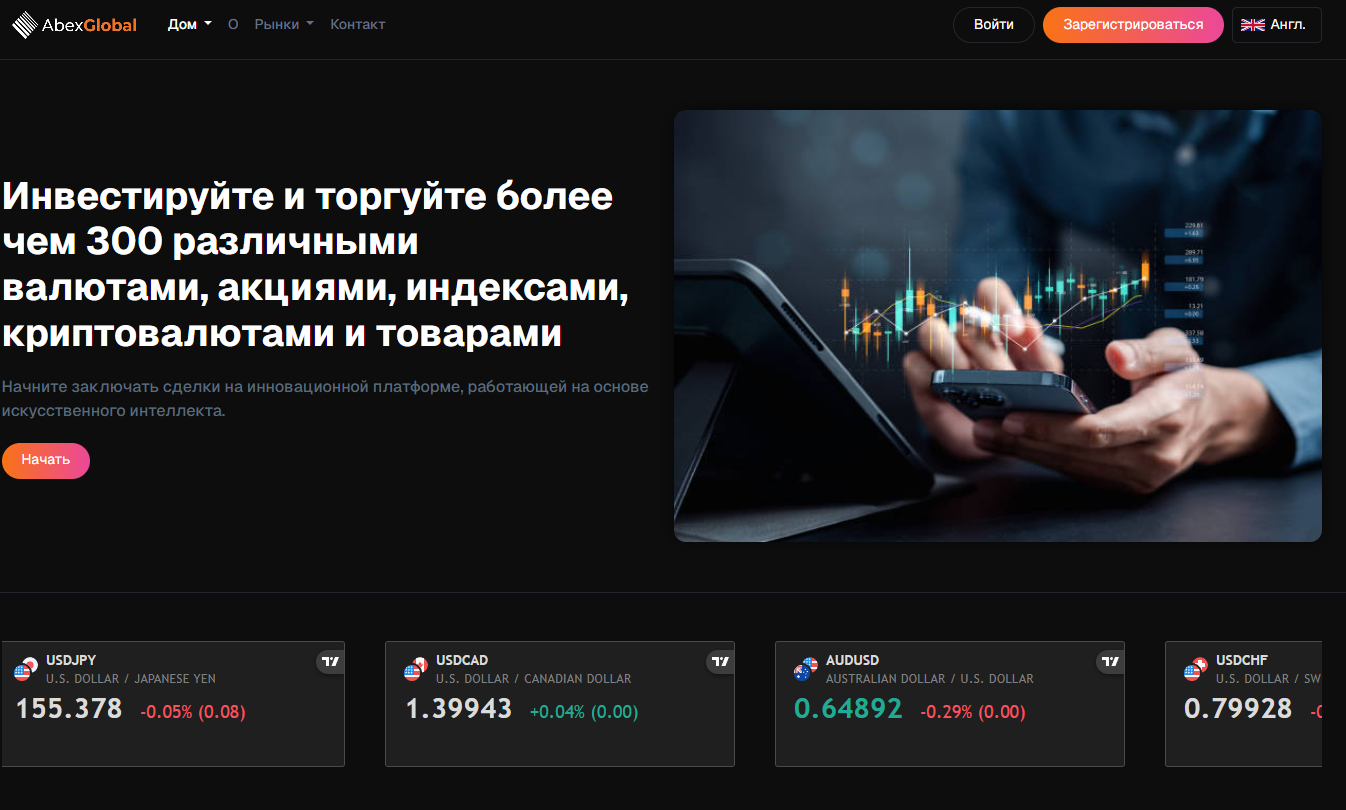 AbexGlobal называет себя надежным CFD брокером с опытом более 10 лет. Сервис дает доступ к 300+ активам на мировых рынках. Клиенты могут торговать валютными парами, акциями, сырьем и криптой.