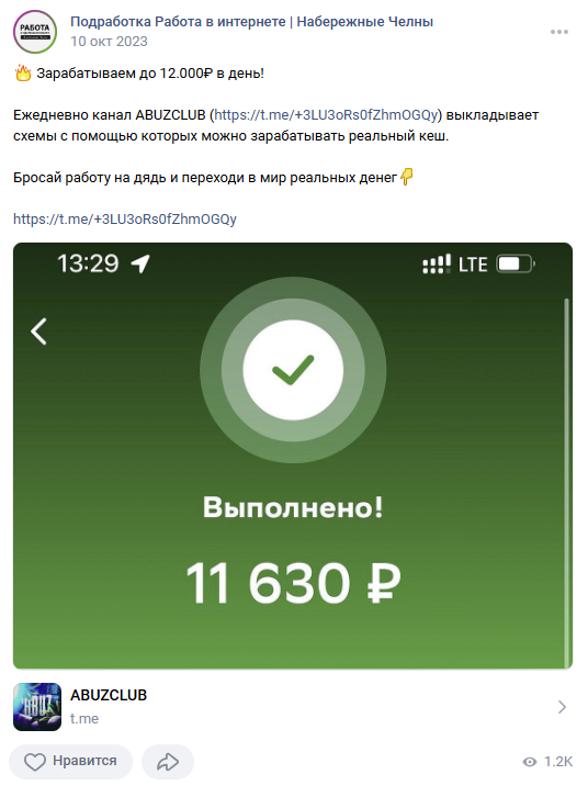 На канале Abuzclub можно найти и посты о способах заработка без “абузов”, рекламу сомнительных проектов, различных прибыльных тем и сервисов. Конечно, некоторые или многие из них являются скамом.В интернете о проекте практически нет никаких сведений. В сети не имеется отзывов подписчиков каналов, рецензий и обзоров правозащитников. Нам удалось найти только небольшой рекламный пост во “Вконтакте”. Он представлен на скриншоте ниже.