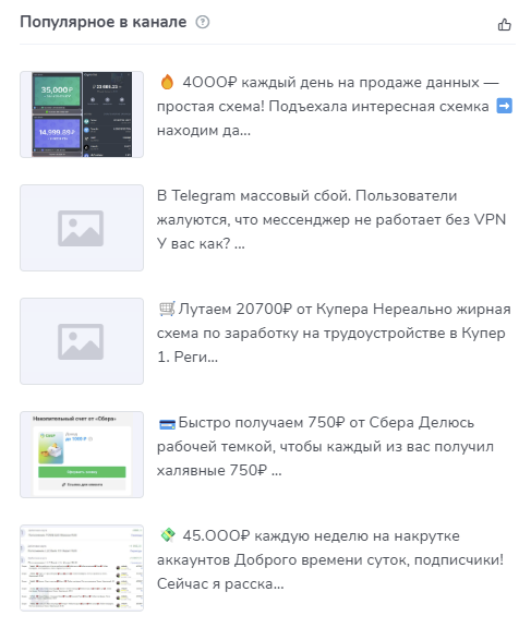 Похоже, что привлечение подписчиков телеграмм-каналов в сомнительные проекты и является основным способом заработка создателей Abuzclub. Своеобразное “зеркало” основного из них имеется на платформе Tgstat ru. Наиболее популярными постами являются представлены ниже на скриншоте.