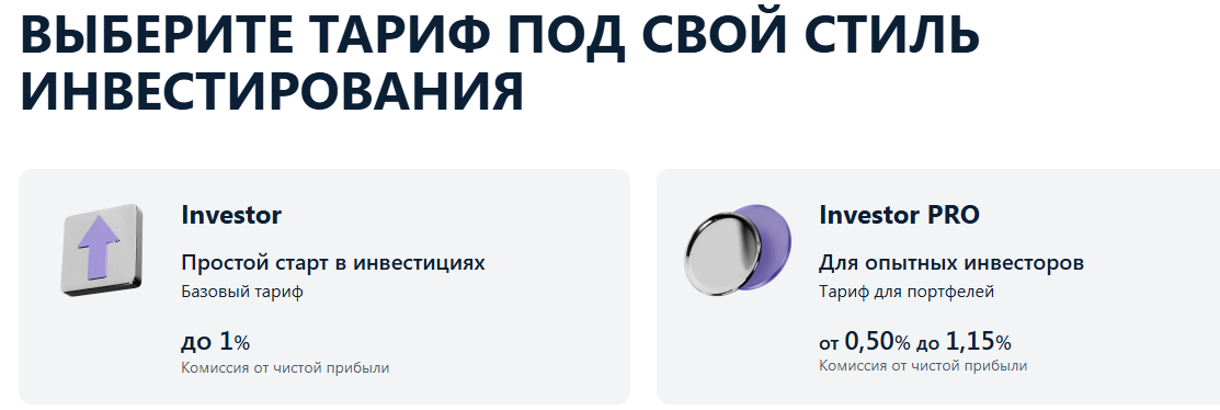 - Investor – базовый вариант для новичков в инвестициях. Комиссия составляет до 1% от прибыли.