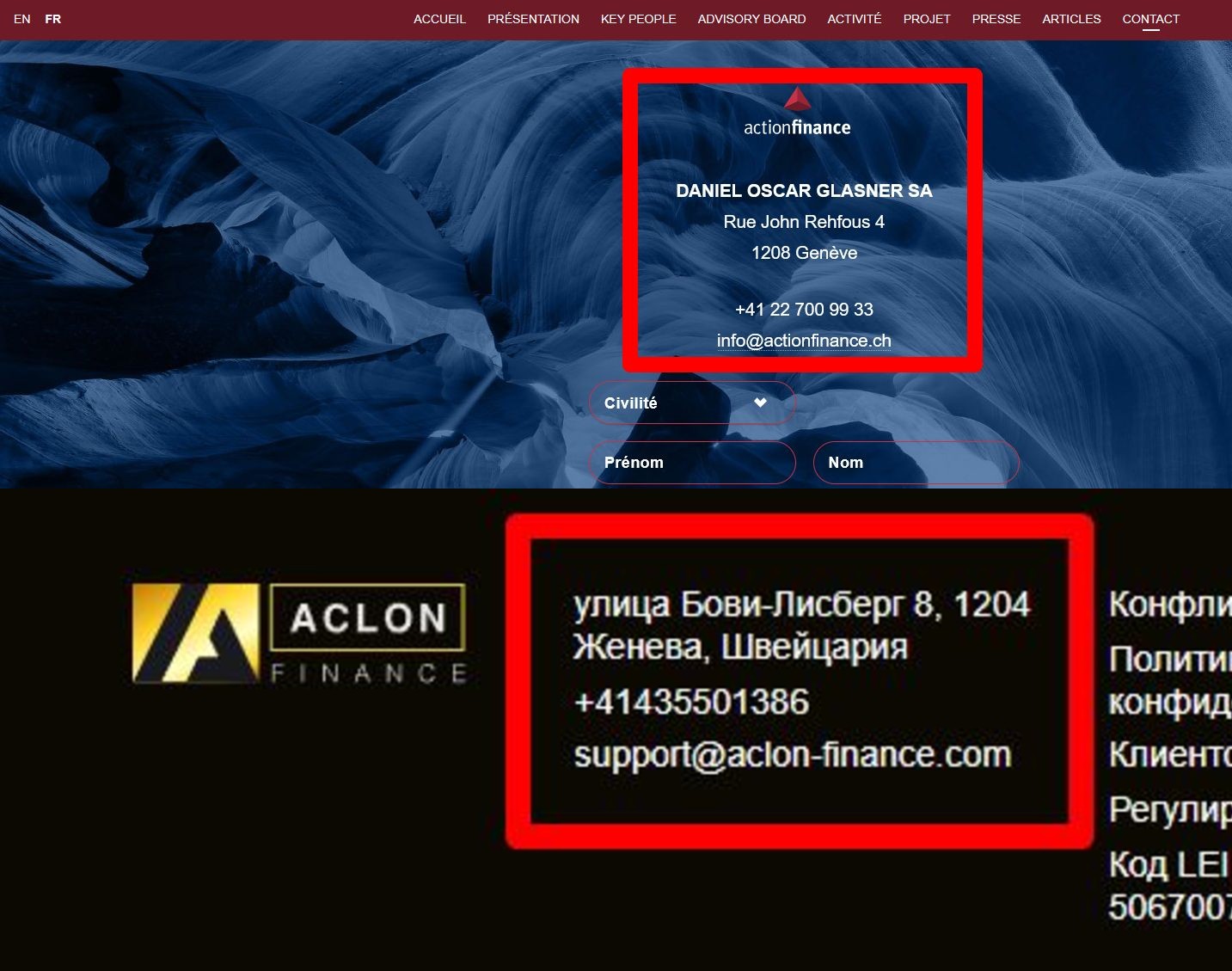 Причем, оригинальный язык actionfinance ch – французский, в отличие от aclon finance com, но адреса офисов у брокеров идентичны.