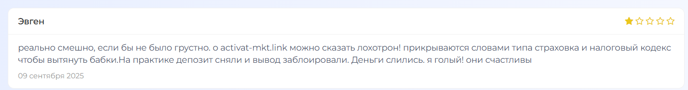 У Act mkt biz в сети множество негативных отзывов, в которых авторов обвиняют в мошенничестве и обмане. Клиенты пишут о том, что получать деньги может только тот, кто имеет доверенное лицо, потому вывести средства проблематично.