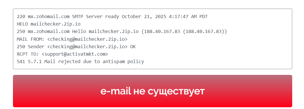 На официальном сайте брокерской компании не указаны телефоны «Акт Мкт» для связи с техподдержкой проекта. Существует электронная почта support@activatmkt com, по которой советуют обращаться к техническому обслуживанию. Однако, как показала проведенная нами проверка, такого адреса e-mail на самом деле не существует, значит написать по указанной почте не выйдет.