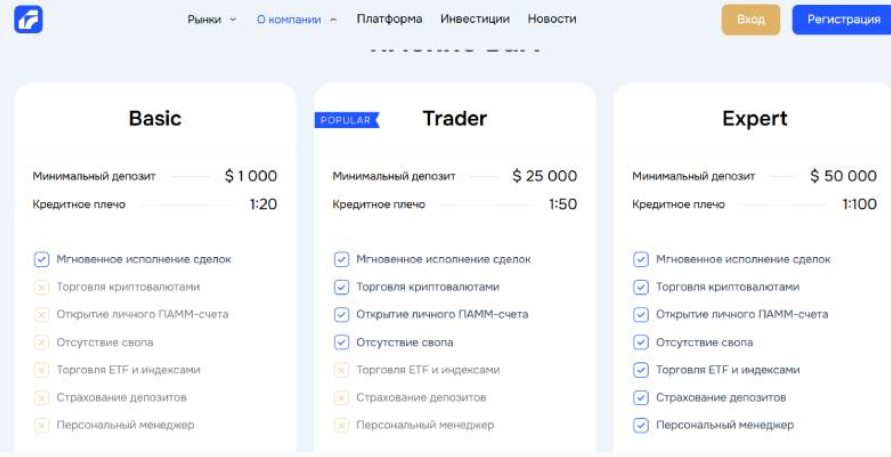 «Акт Мкт» предлагает несколько видов платежного счета, которые нужно пополнить после регистрации аккаунта на сайте брокера. Различные виды счета имеют разные преимущества и чем выше стоимость счета, тем больше привилегий он дает. Для создания минимального базового счета нужно пополнить кошелек на депозит в $1,000. Депозит для трейдеров и экспертов оставляет $25,000 и $50,000. Торговля криптовалютами доступна только с открытием трейдерского счета, а страхование депозитов начинает только на экспертном валютном депозите.