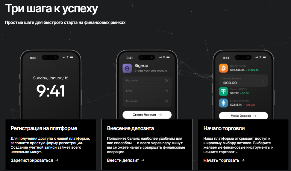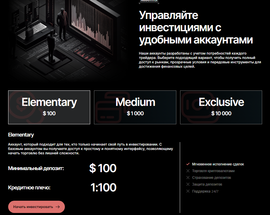 Разработчики обещают прозрачные комиссии и спреды, продуктивный трейдинг и обеспечение высокой скорости проводимых транзакций. На площадке доступно 3 типа аккаунтов. Минимальный депозит, с которым можно начать торговать, составляет 100 долларов.